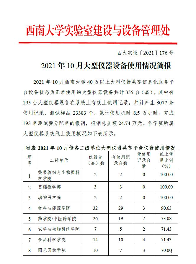 2021年10月大型仪器设备使用情况简报