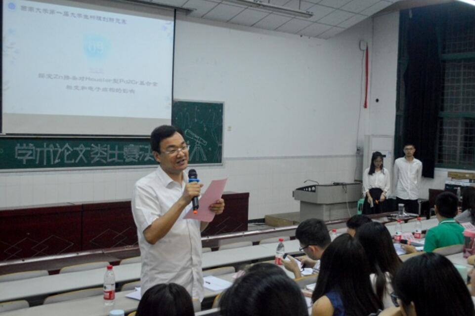 晚上7点,学术论文类比赛也展开了最终的角逐。此次比赛邀请了学院副院长袁宏宽教授、院长助理赵建伟副教授、安春生教授、邓涛教授、陈晓莉副教授、杨科副教授担任嘉宾评委,共有100余名本科生到场观摩。经过初赛的精心筛选,共有5件项目方案书和4篇学术论文进入决赛。此次决赛分为选手演说展示与评委提问点评两个环节。在展示环节,选手分别从目标及拟解决的问题、研究思路、研究方法、创新之处、预期成果等方面对作品进行阐述。从对教育的深思到对科学的探究再到对科技的展望,各组选手在发现与思考中体验科学的魅力、挖掘科学的价值。在总结点评环节,赵建伟老师期望同学们以坚毅之心、投入之心、平常之心在科学探究的过程中体验成长。