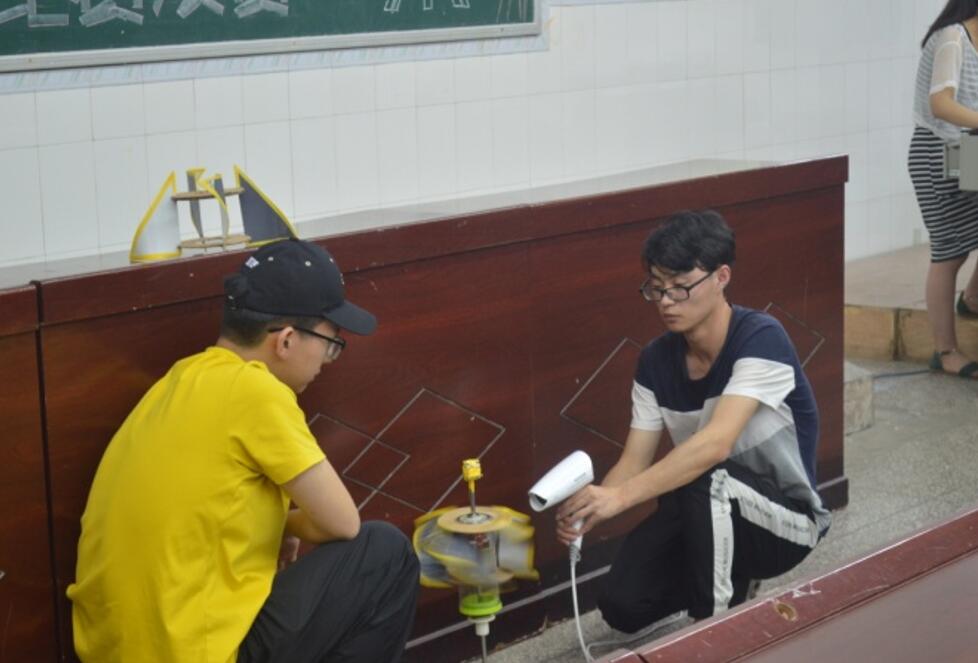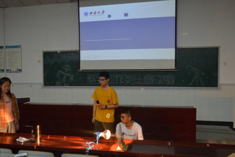 当天下午3点,科技制作类比赛决赛在物理学院大阶梯教室如期举行,共有十一组选手带来了他们的科技作品。学院邓涛教授、陈晓莉副教授、桑文龙副教授担任本场比赛的评委。十一组选手逐一登台展示了各自作品的设计思路、实验原理、设计创新点以及操作演示,实验原理涉及电磁学、光学、力学等多个板块的科学知识。比赛中,不乏有趣味十足的水果电池、风力发电等科普作品,也有实用性强的红外线反射与折射、电容器充放电等实验演示教具。选手展示完毕后,评委老师们依依提出了改进建议,并强调了作品的实用性、创新性和美观性。